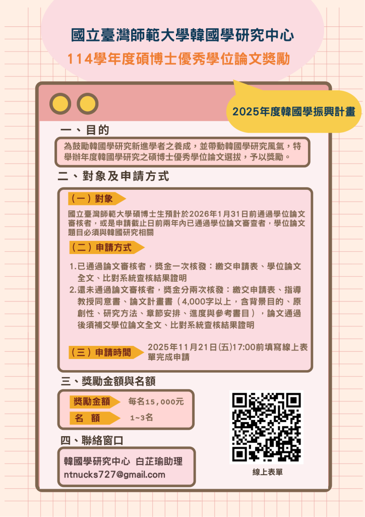 【獎勵金申請】114學年度碩博士優秀學位論文獎勵